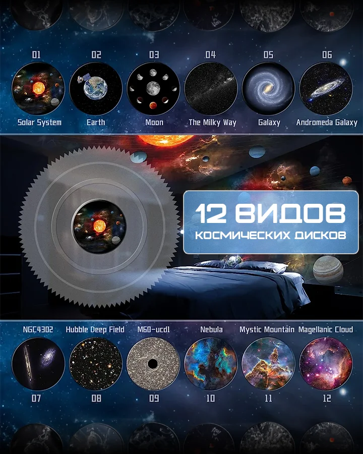 В комплект входит 12 различных проекционных дисков: