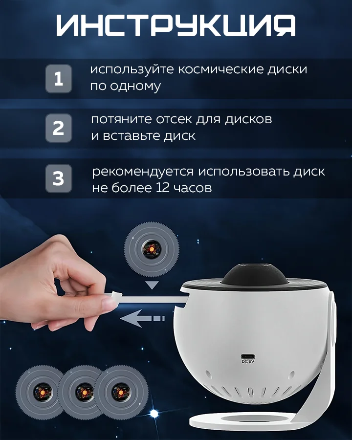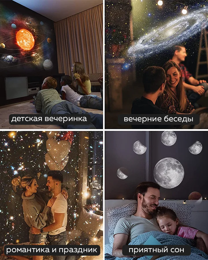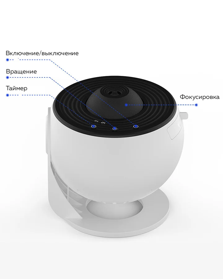 Проектор работает бесшумно. Скорость вращения имитирует космические изменения. Вы можете установить таймер
