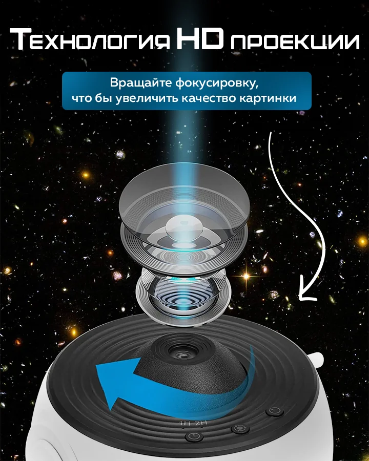 Проектор оснащен высокоточными линзами, которые создают реалистичное изображение звездного неба